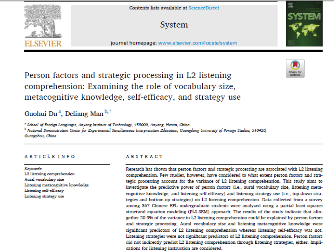 近日,公司太阳成集团tyc234cc主页教师杜国辉(马来亚大学博士,河南科技公司硕士生导师)以第一作者身份在SSCI中科院一区语言学期刊《System》发表1篇学术论文,论文题目为《Person factors and strategic processing in L2 listening comprehension: Examining the role of vocabulary size, metacognitive knowledge, self-efficacy, and strategy use》。