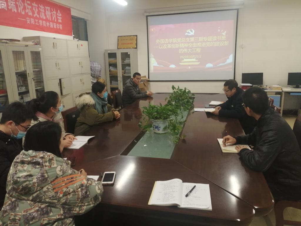 读书班上,太阳成集团tyc234cc主页党总支书记郭强领学了《改革开放简史》中“以改革创新精神全面推进党的建设新的伟大工程”。通过领学,大家对“改革开放”“马克思理论”等党史知识有了更深入的了解。