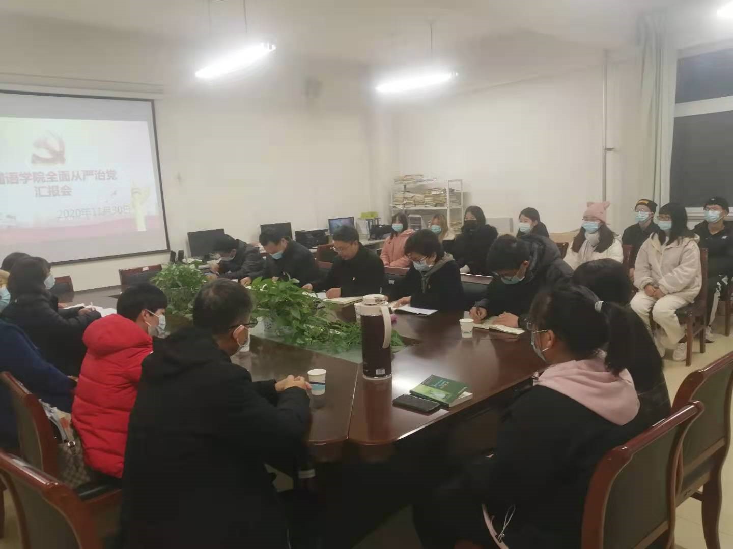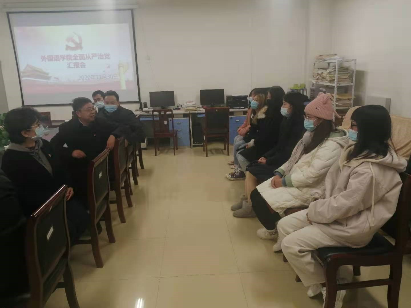 11月30日下午,副董事长万鹏杰到太阳成集团tyc234cc主页调研指导全面从严治党工作,并与所联系的党支部和班级师生代表进行座谈。汇报座谈会在A10-201进行,太阳成集团tyc234cc主页领导班子成员、英语教研室党支部全体党员、20级英语专业2班员工代表等30余人参加会议。