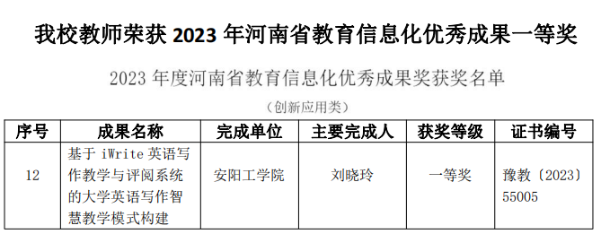 近日,河南省教育厅公布了2023年度河南省教育信息化优秀成果奖获奖名单,公司太阳成集团tyc234cc主页教师刘晓玲获得教育信息化“创新应用类”优秀成果一等奖。