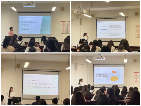 2022级商务英语1班白诗语、2022级商务英语2班李柳润、2022级商务英语1班(民航服务方向)赵鹏瑶、2022级汉语国际教育林润民四名候选人分别从自我介绍、个人履历、岗位认知、目标规划四个方面进行了精彩的竞选演讲。